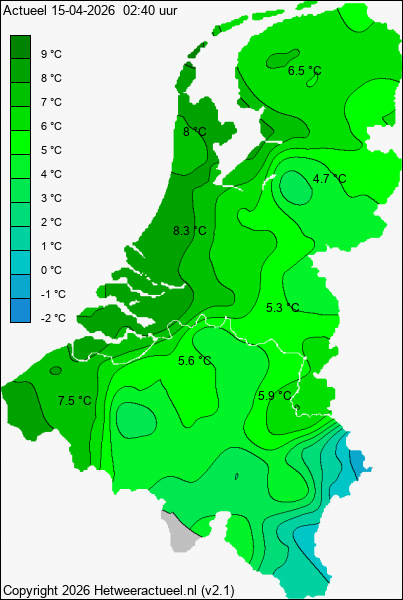 het kaartje met de actuele temperatuur wordt iedere 10 minuten opgebouwd uit de actuele gegevens van alle weerstations, mits de data minder dan 1 uur oud is.