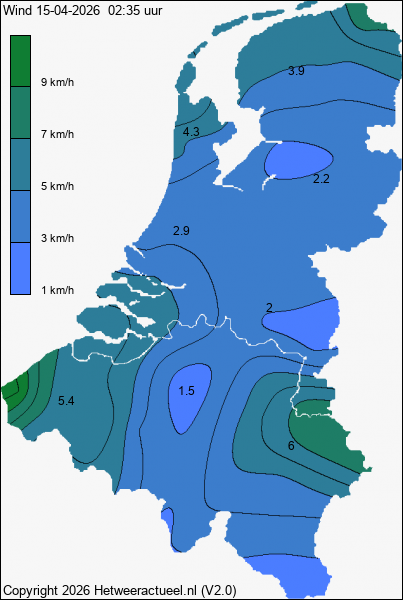 het kaartje met de actuele wind windsneldheid (10 minuten gemiddelde) wordt 2 keer per uur opgebouwd uit de actuele gegevens van alle weerstations, mits de data minder dan 1 uur oud is.